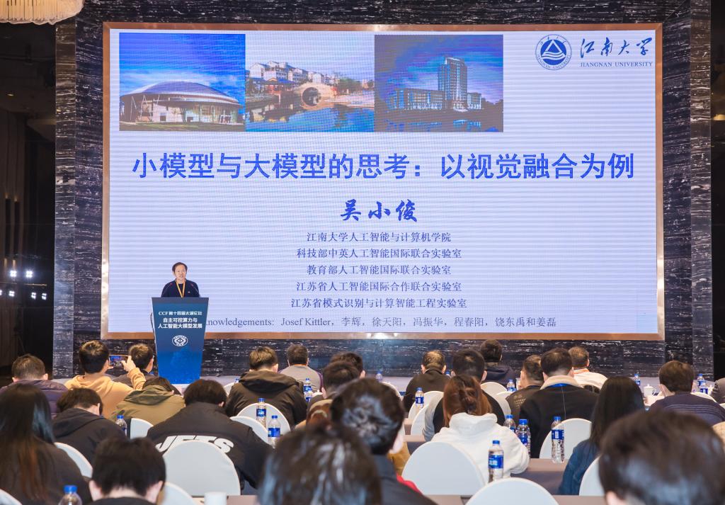 研究生院院长吴小俊做了《小模型与大模型的思考:以视觉融合为例》的主题报告;他阐述了视觉融合中大模型、小模型的应用场景,介绍了团队的科研成果,强调基于不同的场景,既要抓住大模型发展机遇,也要充分利用传统小模型的方法和手段。