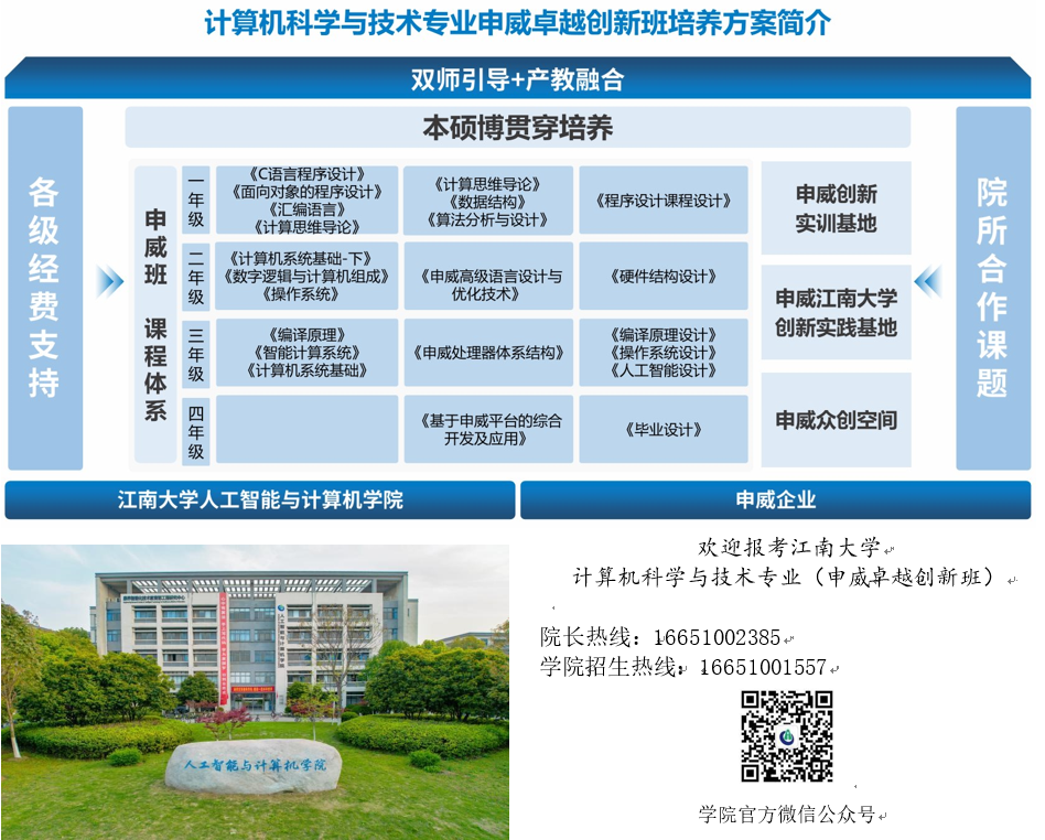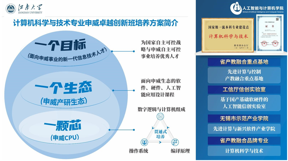 于 1994 年开设的计算机科学与技术专业,该专业入选首批国家级一流本科专业建设点,已经通过中国工程教育认证,是国家级特色专业建设点、入选了江苏省产教融合品牌专业;也已经与国家超级计算无锡中心等单位共同建设了“基于国产基础软硬件的人工智能信创实验室”、先进计算与控制江苏省产教融合重点基地,是无锡市示范产业学院的重点建设专业。我们相信,在此基础上一定能够培养出优秀的设计申威计算机和应用申威计算机的创新型人才。