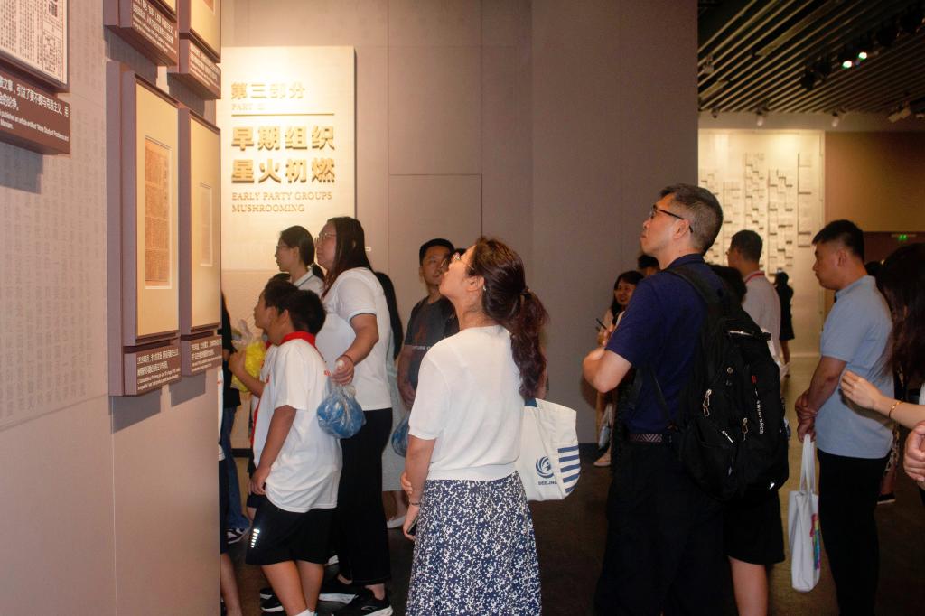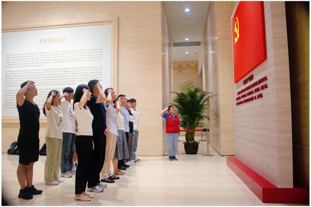 在中共一大会址纪念馆内,由王莉莉进行领誓,实践队师生面对党旗举起右拳,庄严宣誓,共同重温入党誓词,感悟初心使命,砥砺奋进力量。实践队师生沿着习近平总书记的足迹,认真参观学习展览各板块内容,在历史照片、珍贵文物、真实史料中深入了解中国共产党在上海创建的光荣历史、奋斗历程以及取得的辉煌成就。