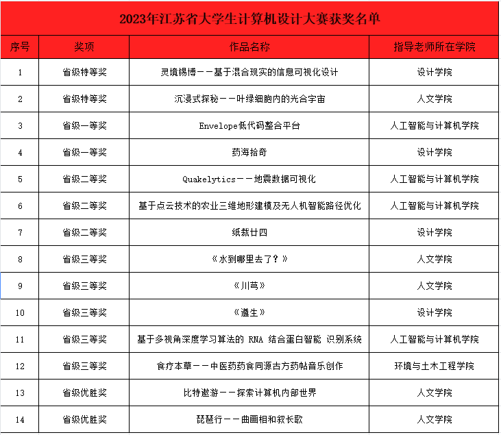 近日,2023年江苏省大学生计算机设计大赛决赛成功举办。经过为期两天激烈的角逐,我校共获得特等奖2项、一等奖2项、 二等奖 3项、 三等奖5项、优胜奖2项,三名指导教师获评优秀指导老师,久久小说