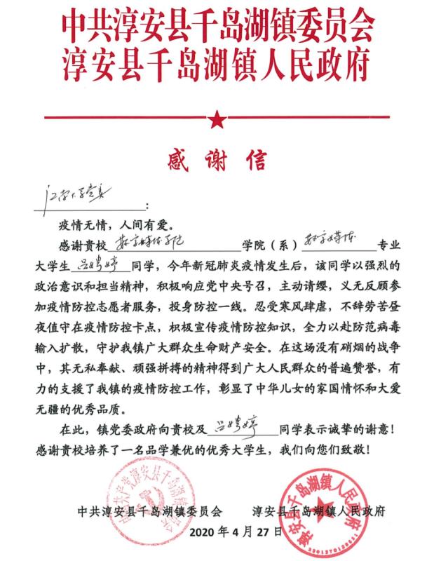 数媒1802班的吕娉婷平时就热心公益,在2月15日到2月17日期间,她参与了浙江杭州千岛湖南苑社区的疫情防控志愿服务。“当时看到社区招募志愿者,我就立马报名参加了,社区给我分配了两个工作日。早上六点,我戴好口罩,站在小区的专门服务点,配合社区的工作人员,对进出小区的人进行登记,查看、核实他们手机上的健康绿码。二月份我们小区进进出出的人并不多,在服务点连续站岗几个小时有点冷也有点累,但是为社区服务真的很开心。”当被问到志愿服务经历时,吕娉婷同学这样说到。当地政府——淳安县千岛湖镇人民政府也向学院发来感谢信,对久久小说