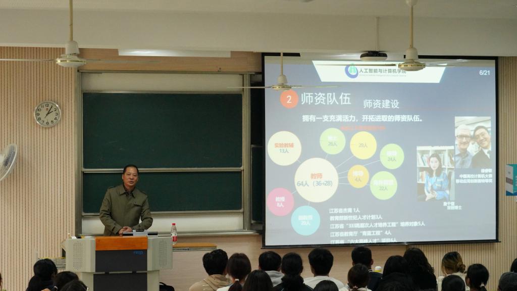 为提高2021级新生对学院办学理念、专业特色、行业优势的认识,牢固树立专业学习的长远目标,从而更好地规划自己大学四年的学习生活,11月23日下午,学院在1A205教室召开人工智能专业思想教育;11月17日下午,在二教2C211/2C212教室分别开展了计算机科学与技术和数字媒体技术两个专业的专业思想教育。其中,研究生院院长、博士生导师吴小俊教授担人工智能专业主讲;智能感知与无损检测技术实验室负责人、博士生导师李光辉教授担任计算机专业主讲;分管学院本科教学工作的夏鸿斌副院长担任数字媒体技术专业主讲。学院党委副书记、副院长陈祎,新生辅导员杜磊、杨玉莹以及三个专业的全体本科生参加本次讲座。