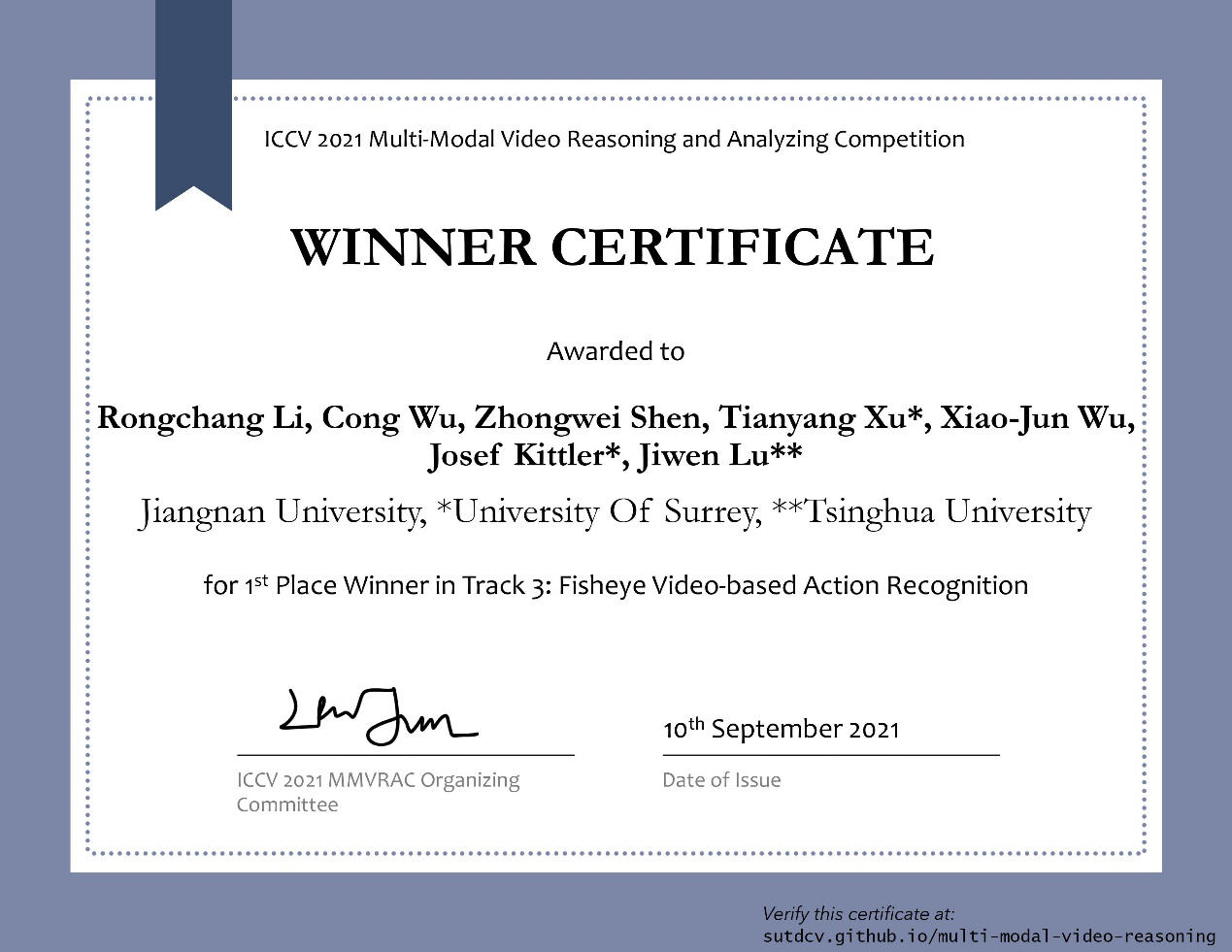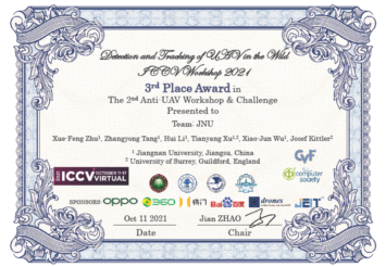 此前,在2021下半年人工智能领域顶级会议国际计算机视觉大会(IEEE International Conference on Computer Vision, ICCV2021)上,我校团队与英国Surrey大学和清华大学合作荣获了多模态视频推理分析比赛MMVRAC中2项冠军(吴聪,李荣昌,沈忠伟,徐天阳,吴小俊,JosefKittler,鲁继文)和第二届CVPR反无人机Anti-UAV跟踪竞赛季军(朱学峰、汤张泳,李辉,徐天阳,吴小俊,JosefKittler)。近年来我校大力推进市校合作和国际合作,大力支持人工智能快速发展,我校在人工智能领域获得的这些重要荣誉和奖项,将进一步提高久久小说