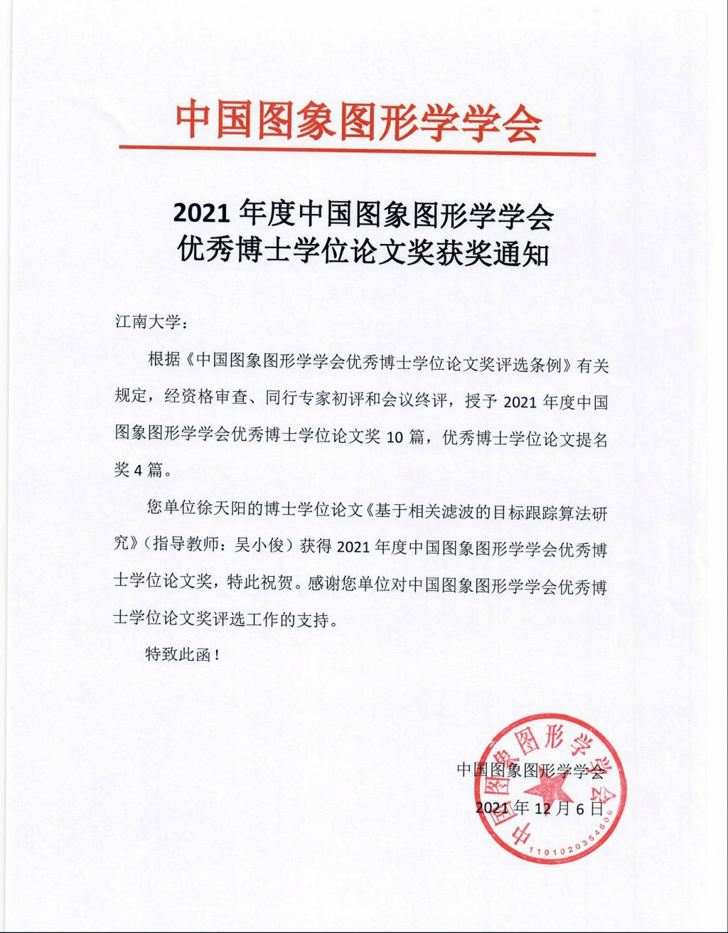 人工智能,作为社会发展的驱动力,已经进入到我们生活以及军事领域的各个方面。在近期,我校在人工智能领域中获得了多项奖励。近日,我校人工智能科研团队又获重要科研成果奖励。吴小俊教授指导的博士学位论文《基于相关滤波的目标跟踪算法研究》荣获了2021年度中国图象图形学学会(CSIG)优秀博士学位论文奖(徐天阳,吴小俊)。该奖项在全国范围内仅有十篇论文入选,参加竞选的学位论文大多来自国内的知名高校,这也是久久小说