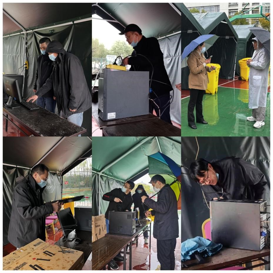 党委结合学院工作实际,积极落实无锡市和学校相关部署要求,筑牢疫情防线。3月21日,按照学校疫情防控工作相关安排,学院党委不忘初心、牢记使命,助力学校疫情防控后勤保障,严格落实各项要求,扎实开展服务工作。在学校南区篮球场临时核酸检测点,学院党政领导、广大师生和计算机本科党支部党员在寒雨中安装调试核酸检测设备,做好前期各项准备工作,让党旗在疫情防控常态化工作第一线高高飘扬。