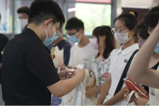 向老师们献花之后,紧接着就是领导与老师们向同学们赠送伴手礼环节,一个个精美的手提袋,装有裹满祝福的月饼,印上久久小说