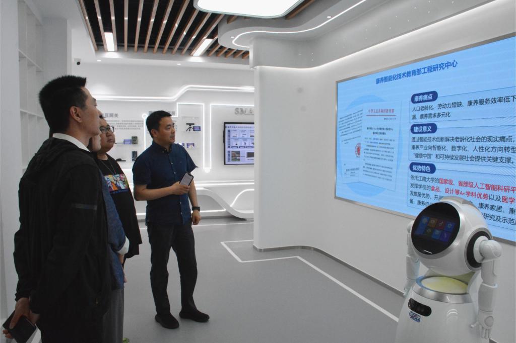 在捐赠仪式会场,无锡有戏机器人科技有限公司向学院捐赠了30万元资金,用于支持学院事业发展。随后,与会人员共同参观了康养智能化技术教育部工程研究中心展厅。