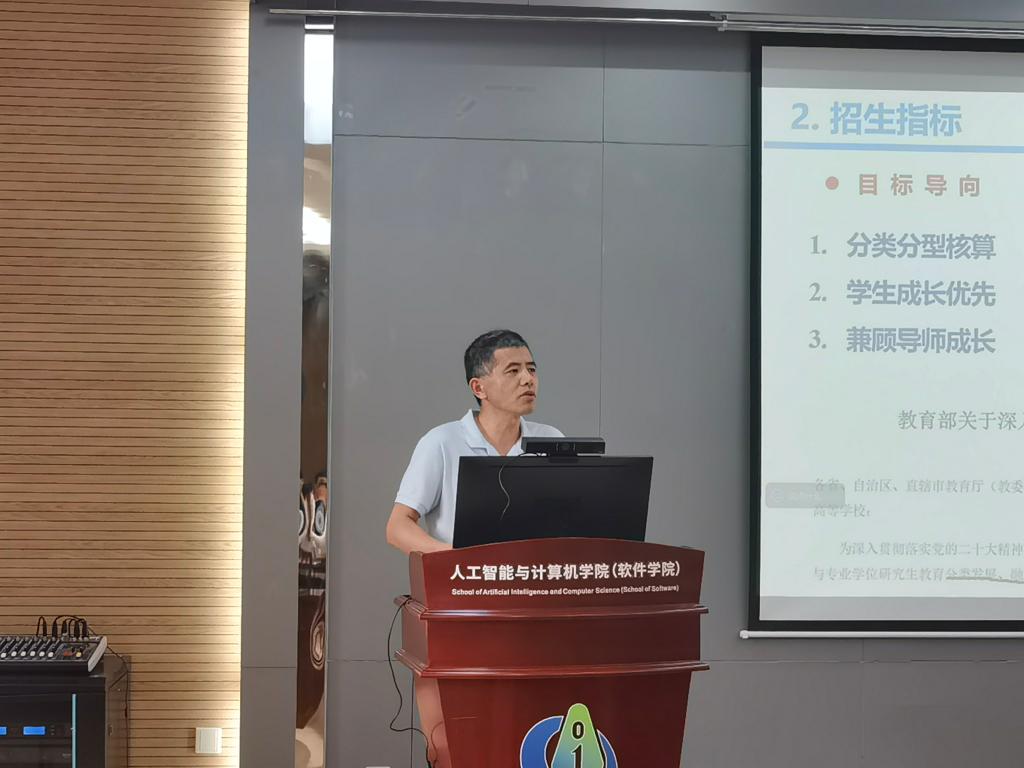 第一项议程是学院招生培养工作政策改革要点说明。谢院长从学院的招生工作、招生指标、学位授予等三个方面内容进行汇报,详细解说了以上内容的目标导向、改革措施。