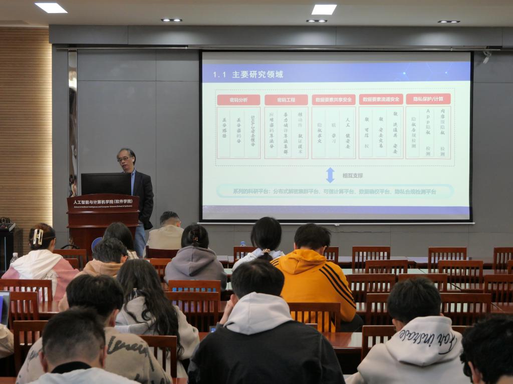 “江南讲坛”第一百四十六讲在人工智能学院B310报告厅举办。本次讲座以“面向数据要素流通的可仲裁确权及安全交易技术”为主题,特邀上海交通大学长聘教授、博士生导师邱卫东主讲。