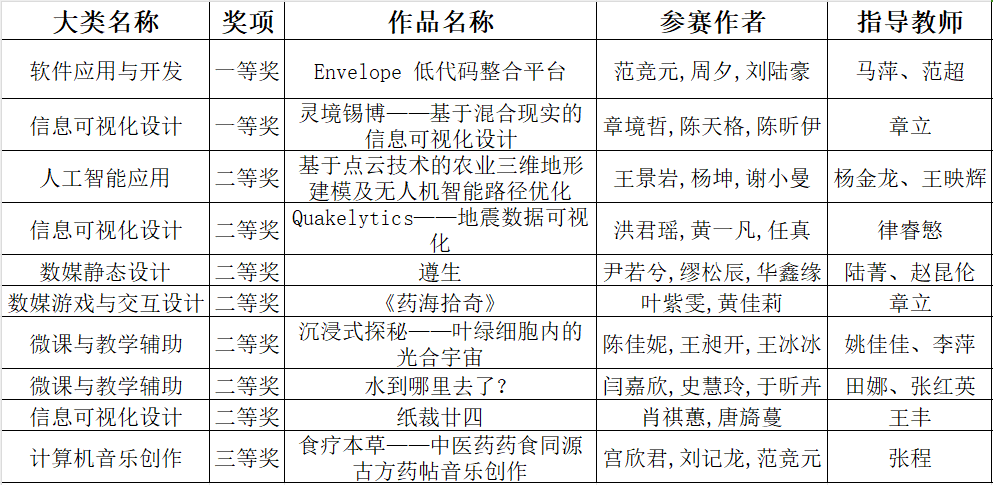 9月1日,2023年(第16届)中国大学生计算机设计大赛国赛评选结果揭晓公示。我校12支代表队与南京大学、华东师范大学等多所高校队伍斗智斗勇,最终在软件应用与开发、信息可视化设计、人工智能应用、数媒静态设计、数媒游戏与交互设计、微课与教学辅助、计算机音乐创作等7个赛道中脱颖而出,分别获得一等奖2项、二等奖7项、三等奖1项。人工智能学子所负责团队斩获全部一等奖、2项二等奖和1项三等奖。