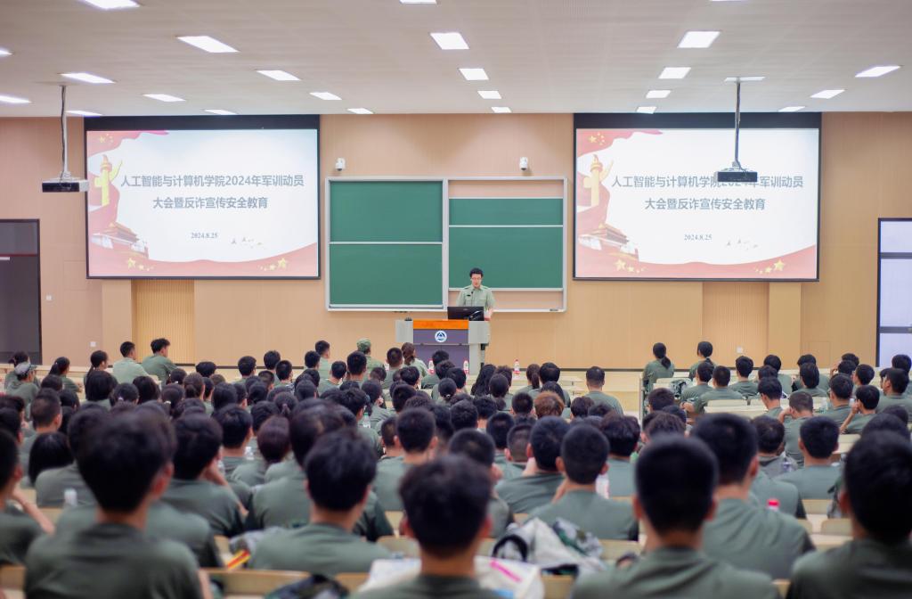会议在庄严的国歌中拉开序幕。刘璇刚作军训动员讲话。他强调,参训学生要充分认识军训的重要意义,以高昂的热情、积极的精神面貌投身军事训练;要严格遵守军训纪律,以军人的标准严格要求自己;要直面挑战,在军训中练出钢铁作风,为大学生涯打下坚实基础。退伍学生代表计科2102班周云飞通过讲述自己参军报国的故事,启发参训学生发扬勇毅拼搏的精神,培养顽强不屈的品质,像军人一样练就铮铮铁骨。新生代表人工智能2404班唐仕晟表示,军训期间将严格服从命令,听从指挥,发扬自强不息、勤劳勇敢的精神品格,争做优秀的智能学子。会上,王莉莉为参训学生代表授予军训旗帜,并作总结发言。她阐述了军训工作的重要意义及学院历来重视国防教育的优良传统,向参训学生提出三点希望:一是要坚定理想信念,永葆家国情怀;二是要坚持刻苦训练,砥砺精神品格;三是要坚决听从指挥,做到令行禁止,鼓励同学们用实际行动争做担当民族复兴大任的时代新人。