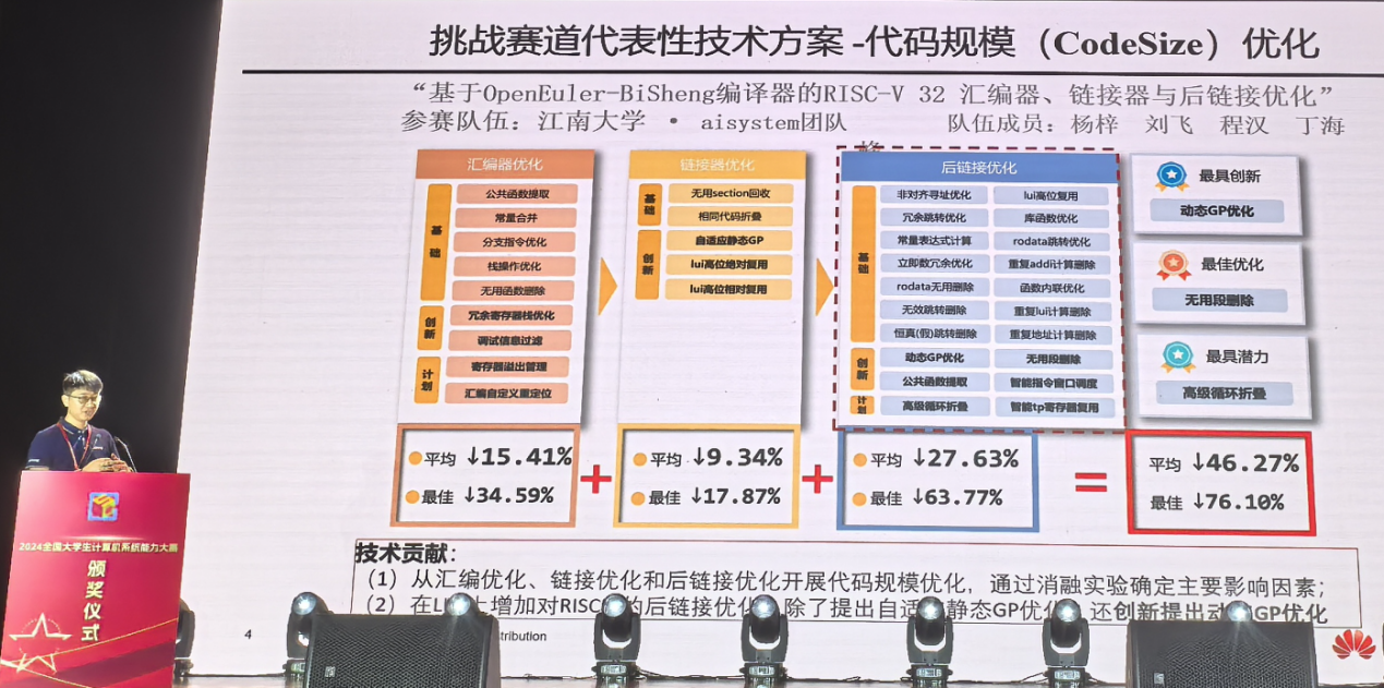 编译系统设计赛竞赛难度大、挑战性高。参赛团队需具备全面的指令集架构知识和完备的编译流程,需要对从高级语言到可执行文件的编译流程都具备宏观架构和微观流程的理解。本届赛题要求基于OpenEuler-BiSheng编译器进行汇编、链接、后链接时优化,团队通过提出后链接优化三步走等创新概念,使用包括动态GP优化在内的30项优化策略,在确保程序功能正确且性能损失合理的前提下,最终在决赛中以46.27%的平均体积缩减率取得了总分第一的成绩,并获得全国二等奖,其技术贡献也获得华为2012实验室-编译器实验室专家的高度评价。