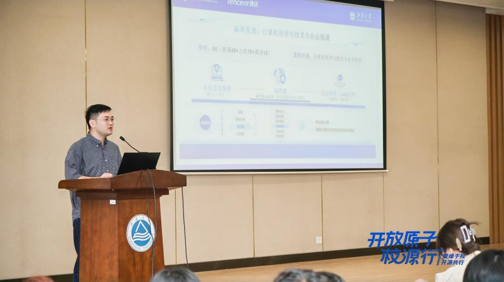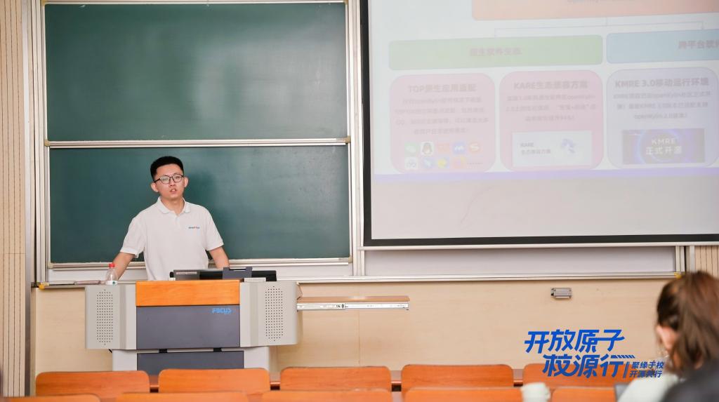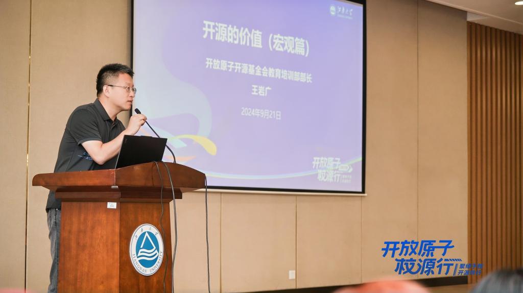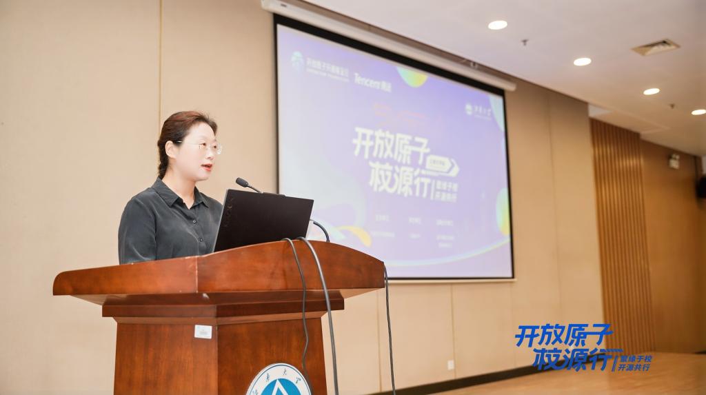 开放原子开源基金会教培顾问李明康在开展了以《从参与者到贡献者:大学生如何在开源社区中成长》为主题的演讲。OpenKylin产品负责人张天雄分享了题为《openKylin开源社区建设实践分享》的报告。太初(无锡)电子科技有限公司的大模型架构师邵柏潭做《AI芯片驱动的RAG算法与大模型创新》的主题演讲。开放原子开源基金会的高级开源项目运营官臧秀涛在开展了《开源分布式数据库OpenTenBase初探》的主题分享。鸿湖万联产融方案总经理连志安为同学们讲授了《OpenHarmony开源教育探索》。浪潮KaiwuDB的资深解决方案专家周幸骏带来《在开源中成长—走进浪潮KWDB社区》的精彩分享。