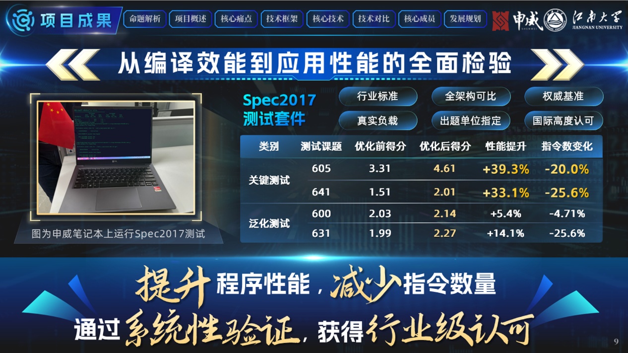 面对传统编译优化启发式规则局限性强、优化组合众多难以选择人工调优低效等行业痛点,团队积极响应“科技自立自强”的时代号召,充分运用人工智能技术构建智能化优化模型,构建了AI驱动的软硬件协同优化智能编译系统,突破了编译优化策略智能生成与编译参数智能调优两大核心技术,在搭载国产WX-H8000处理器的服务器上完成系统性验证,泛化能力强,程序性能得到全面提升。